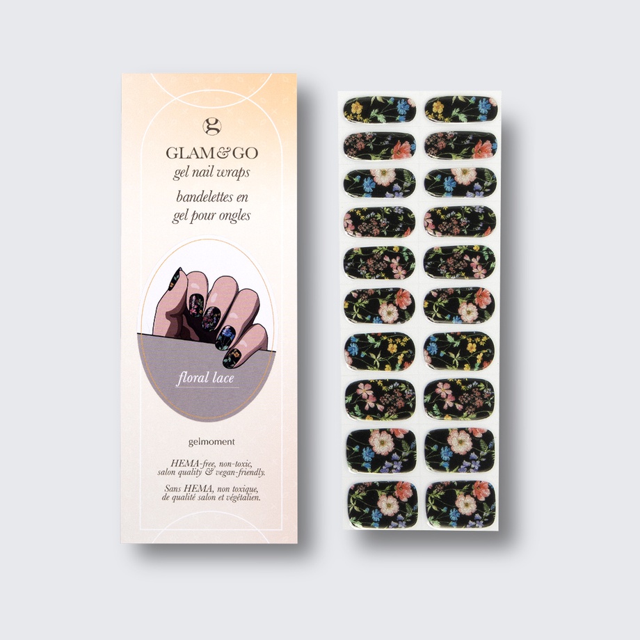 Our GLAM & GO gel nail wraps ensure that no matter how complex your chosen nail design, the application process remains incredibly simple. Our GLAM & GO gel nail wraps require no glue, base coat, or top coat—just peel them off the packaging, apply them to your nail, trim to size, cure twice, and voilà!